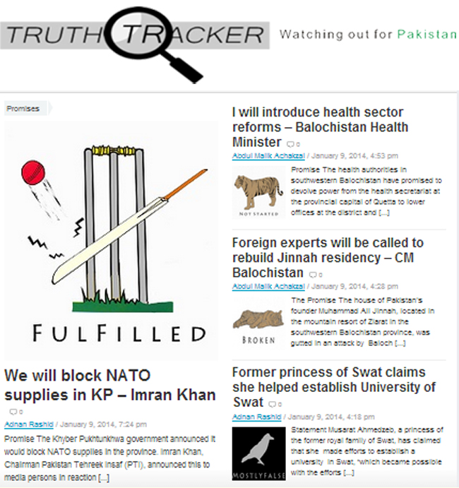 वेबसाइटलाई पाँच भागमा बाँडिएको छ । टुटेको, पूरा भएको, काम भइरहेको, काम सुरु नभएको र सम्झौता भएको प्रतिवद्धता । जस्तो, प्रधानमन्त्री शरीफले पछिल्लो वर्ष चुनावमा कम आय भएको वर्गका मानिसलाई घर उपलब्ध गराउने प्रतिवद्धता गरेका थिए । तर, अहिलेसम्म केही काम भएको छैन । ‘ट्रूथ ट्राकर’ले यो प्रतिवद्धतालाई काम नै सुरु नभएको प्रतिवद्धताको सूचीमा राखेको छ ।